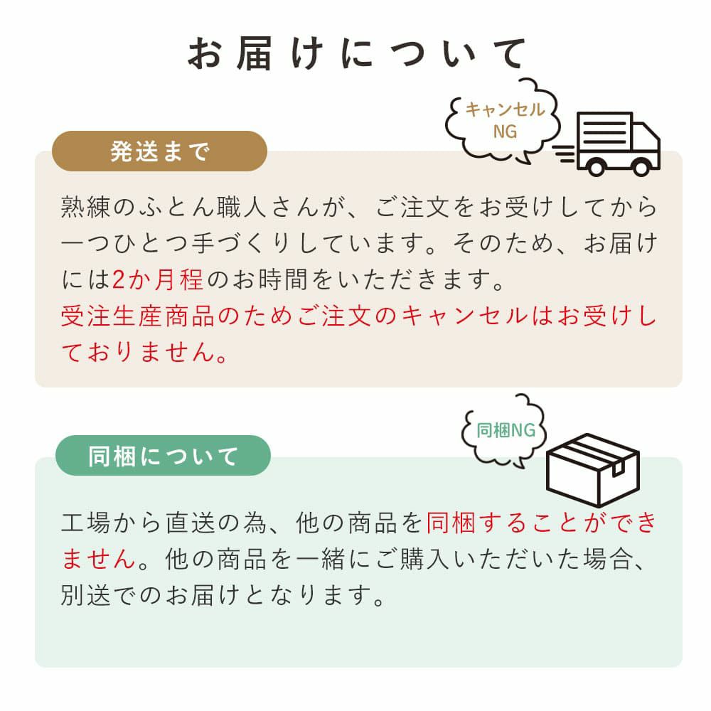 他の画像を見る 手作りの受注生産のため目安納期2か月程。 掛敷ふとんセット[ダブル]【受注生産】 単品合計 ¥ 160,600 のところ セット価格 ¥ 152,570 税込 送料無料 カートに入れる お気に入りに登録する