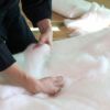 化学繊維を機械で詰めてゆく工程とは違い、一つ一つ手仕事で作り上げてゆく仕立てのお布団は、寝転んだ時に、格別の快適さを感じます。