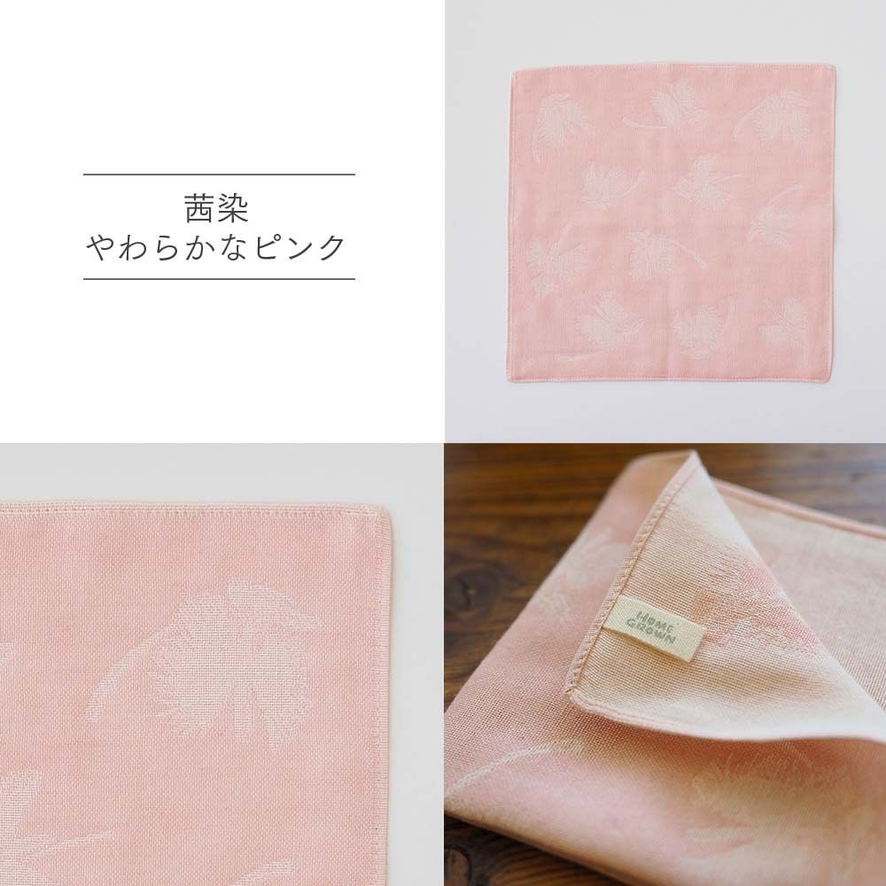 ピンクを染めている茜は日本、朝鮮、中国、台湾に自生している多年草のつる性の草。その茜の根を煮だして染料を作る茜染は古代から用いられた染色方法です。優しく鮮やかな色合いが特徴で、見ているだけで優しい気持ちになれます。