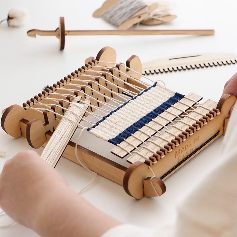 国産の木材を有効活用するため、間伐材などを利用した一枚板から組み立てつくりあげるミニ織り機です。