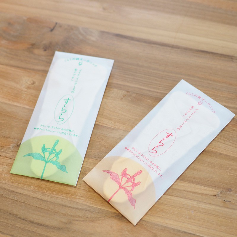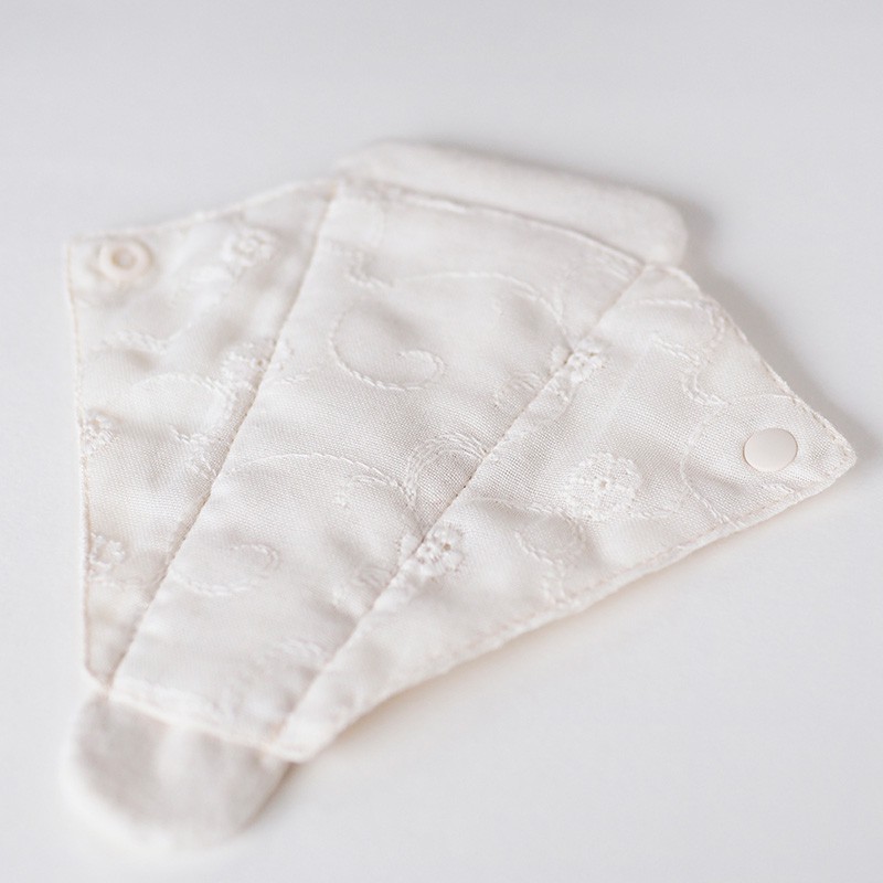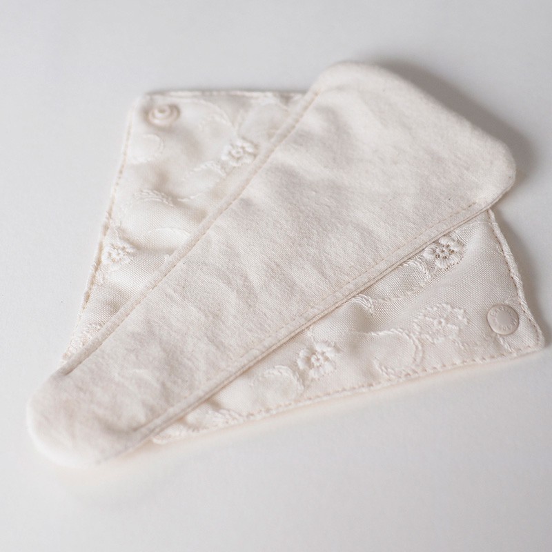 すららの素材は、すべてオーガニックコットン100%。 吸収体としては、オーガニックコットンのパイル生地を採用。縫い糸、刺繍糸もオーガニックコットンのため、デリケートな素肌にとても優しい肌触りです。縫い目が肌にあたらないように、中縫いで仕上げているので、 敏感な期間をやさしく見守る仕様になっています。